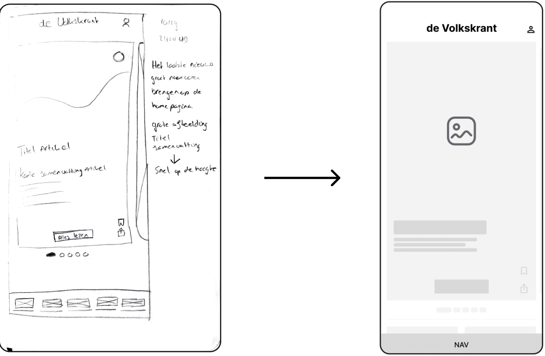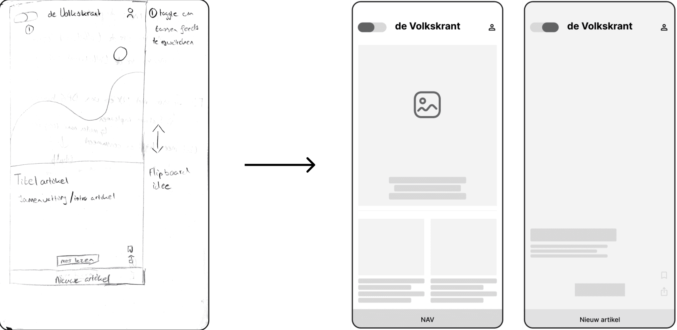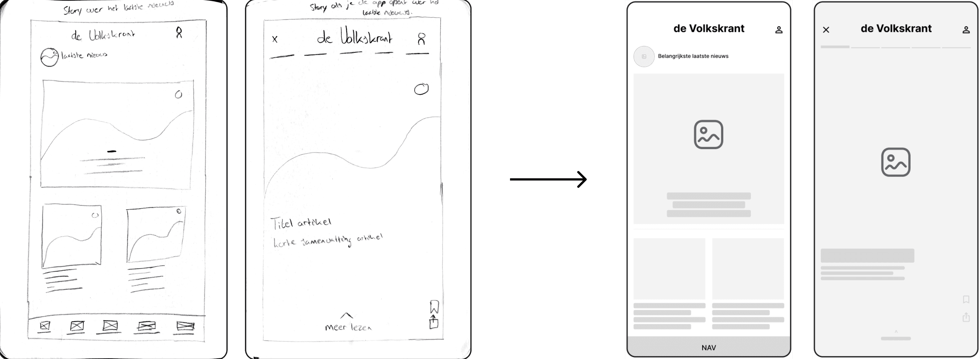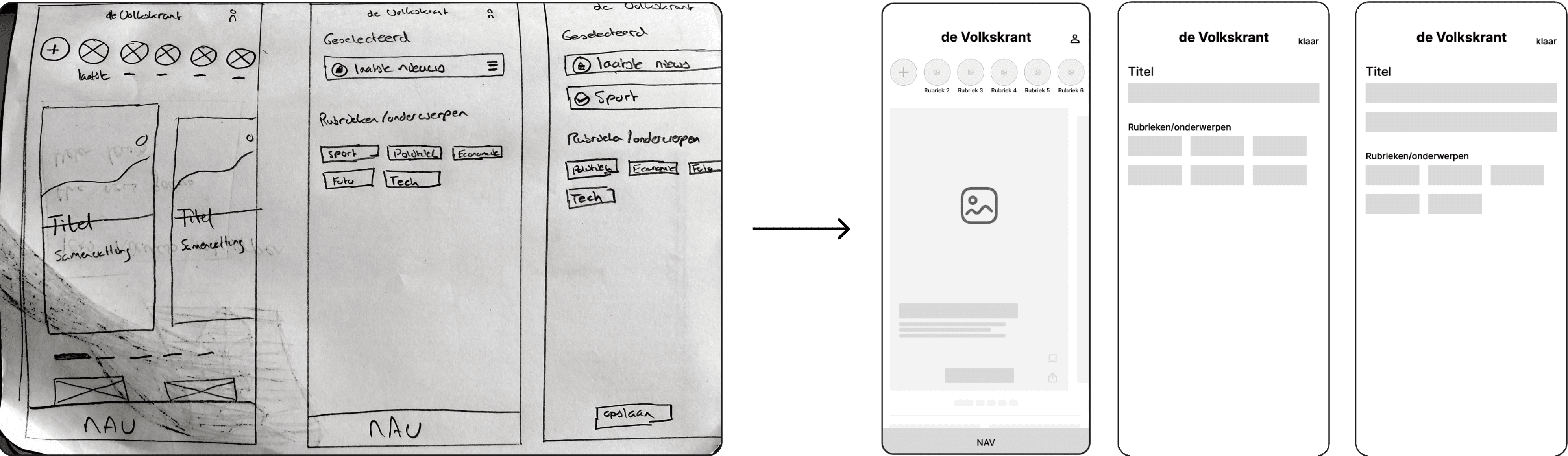 Nadat ik de schetsen had gemaakt en deze vervolgens had omgezet als wifreframes in Figma, heb ik Hi-Fi ontwerpen gemaakt. Dit heb ik gedaan van de 4 concepten en allemaal in de huisstijl van de Volkskrant. Ik heb er tegelijkertijd ook prototypes van gemaakt, zodat ik de werking gelijk kan testen met gebruikers.