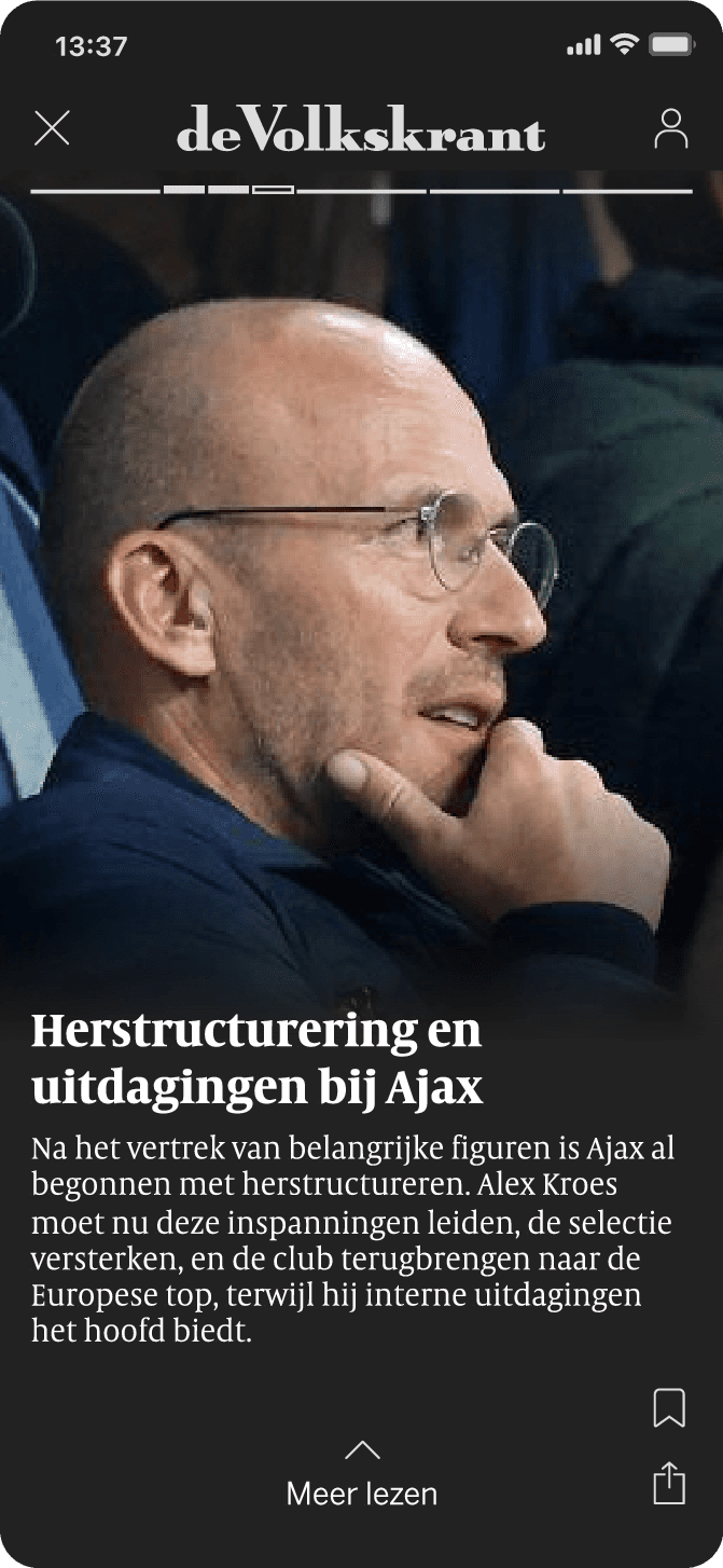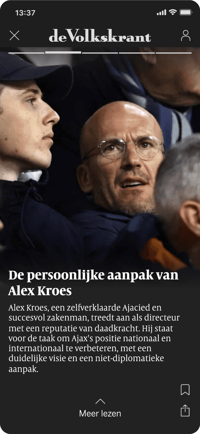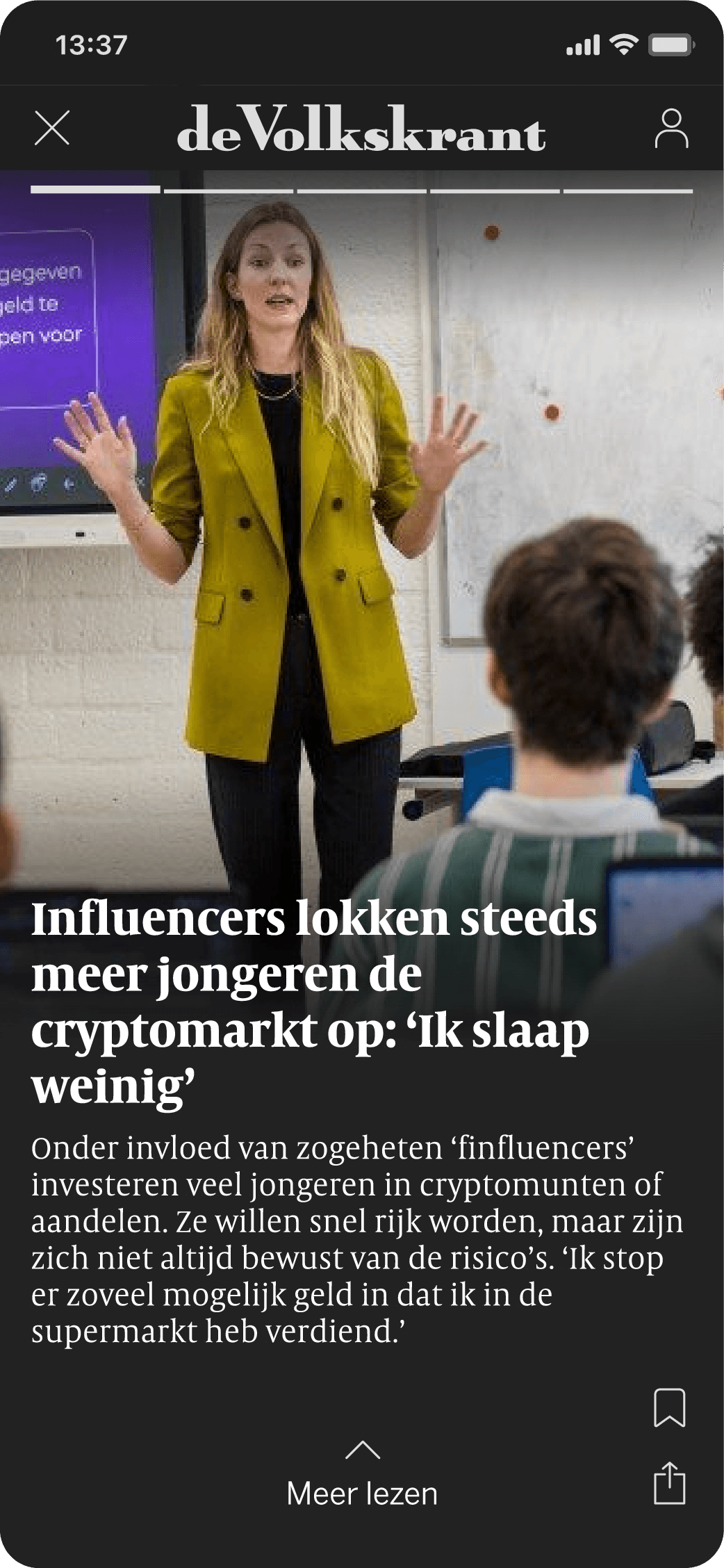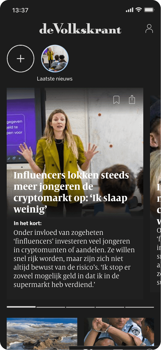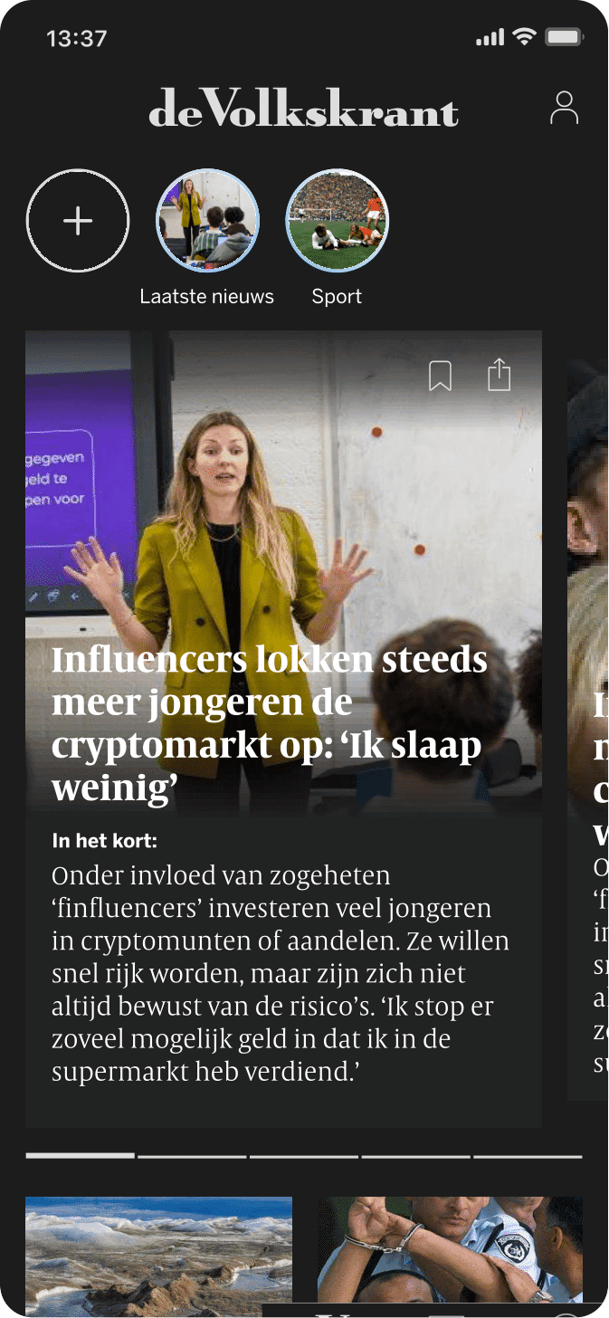 Voor nu heb je alleen een story van het laatste nieuws. De interacties werken precies hetzelfde als de story’s van Instagram. Per post leest de gebruiker een samenvatting van het artikel, zodat diegene snel op de hoogte is van het laatste nieuws. Voor verdere verdieping kan de gebruiker omhoog swipen om het hele artikel te lezen.