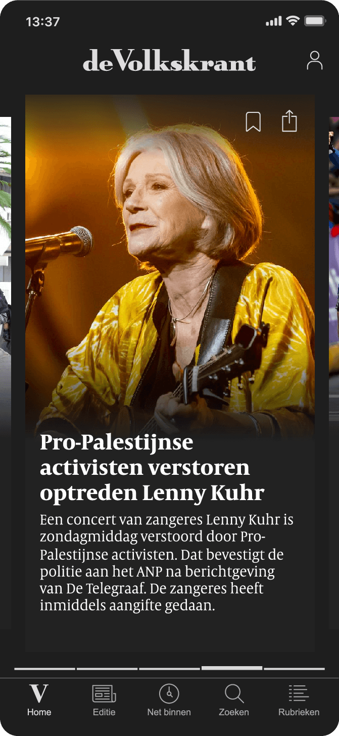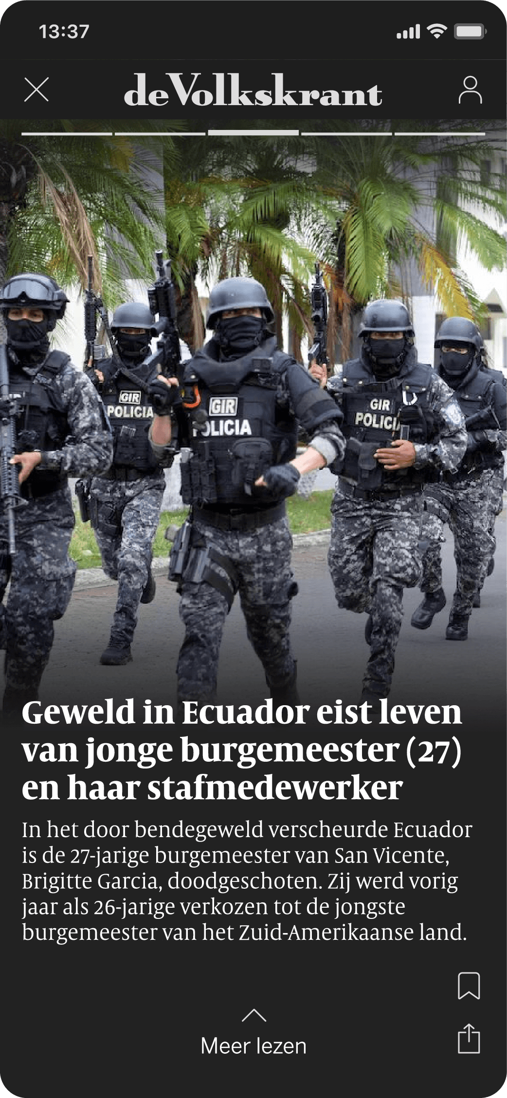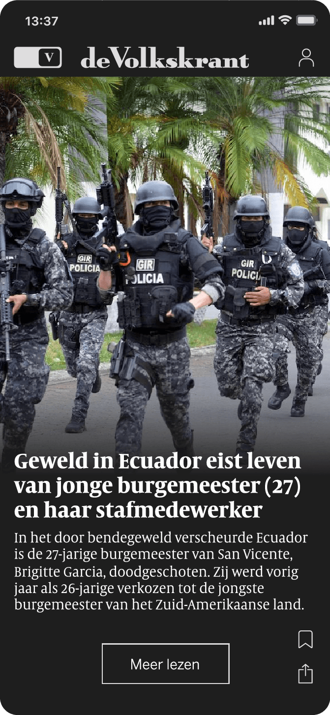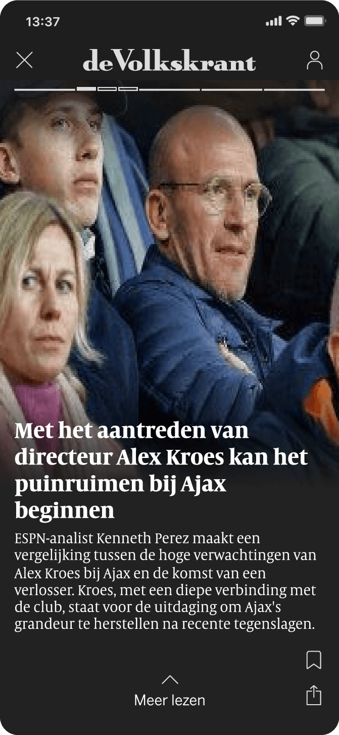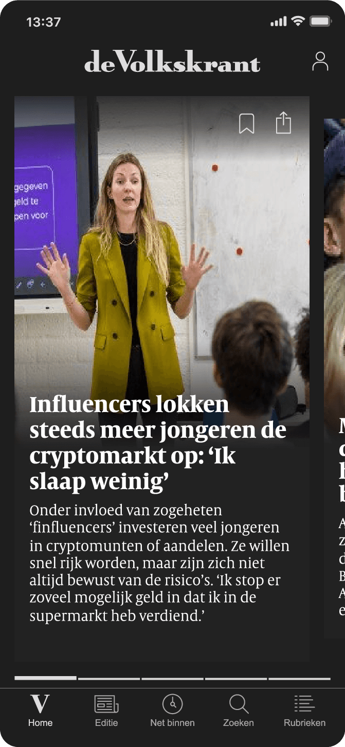 Voor nu heb je alleen een story van het laatste nieuws. De interacties werken precies hetzelfde als de story’s van Instagram. Per post leest de gebruiker een samenvatting van het artikel, zodat diegene snel op de hoogte is van het laatste nieuws. Voor verdere verdieping kan de gebruiker omhoog swipen om het hele artikel te lezen.