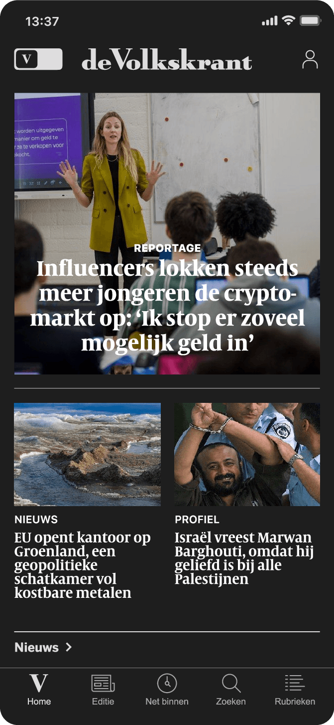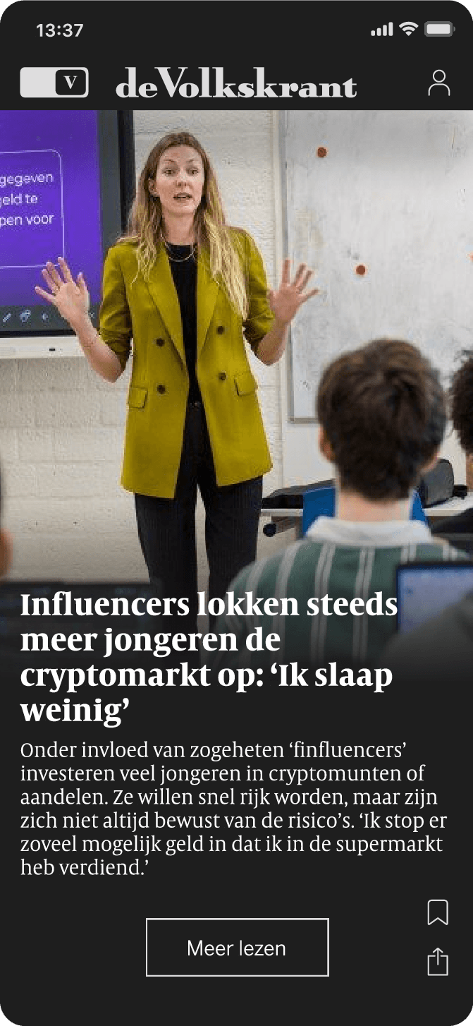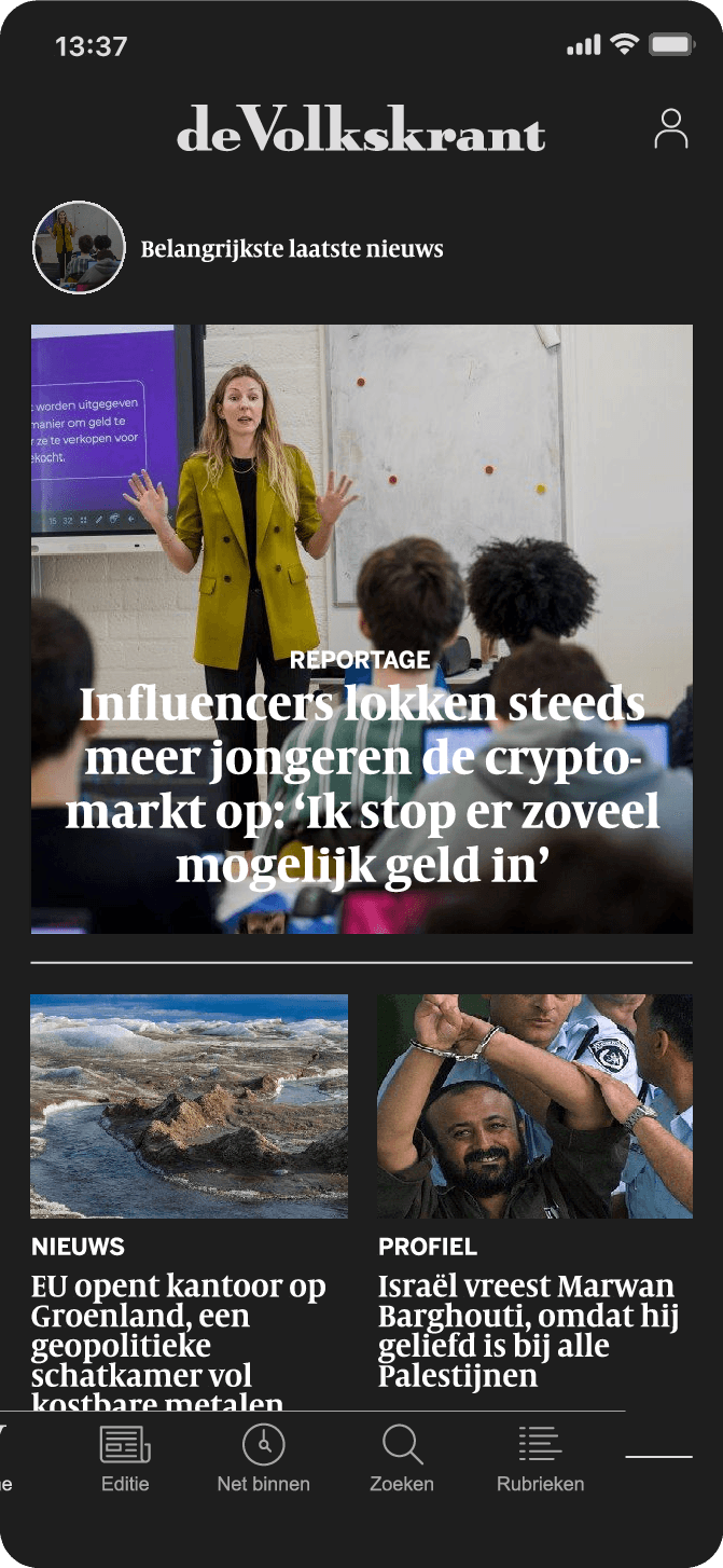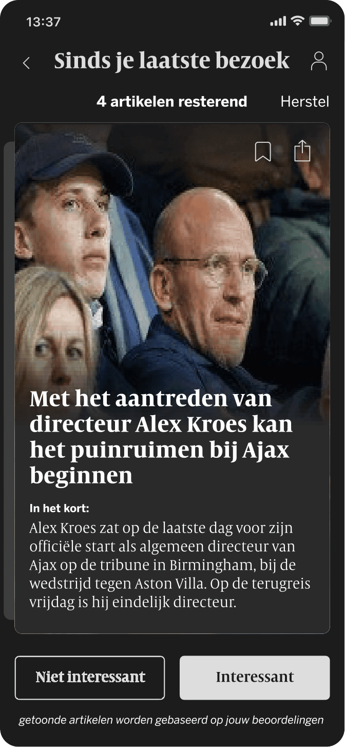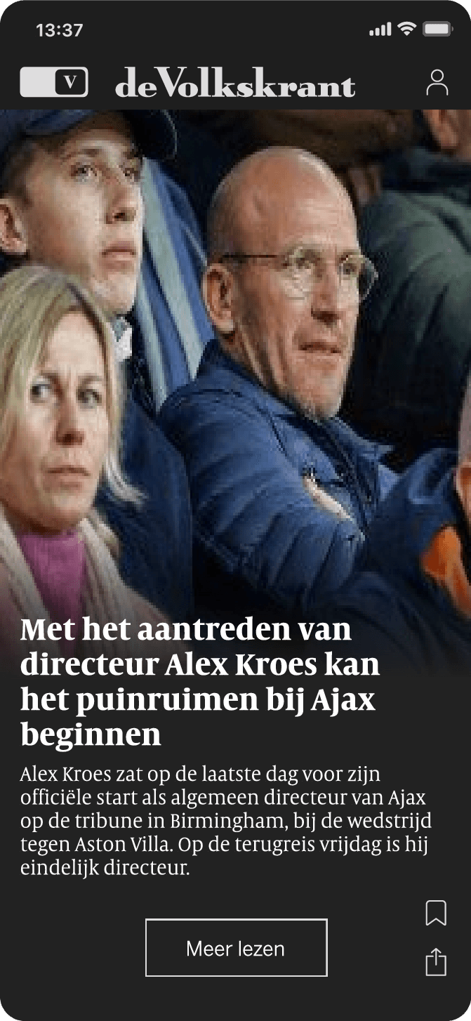 Voor nu heb je alleen een story van het laatste nieuws. De interacties werken precies hetzelfde als de story’s van Instagram. Per post leest de gebruiker een samenvatting van het artikel, zodat diegene snel op de hoogte is van het laatste nieuws. Voor verdere verdieping kan de gebruiker omhoog swipen om het hele artikel te lezen.