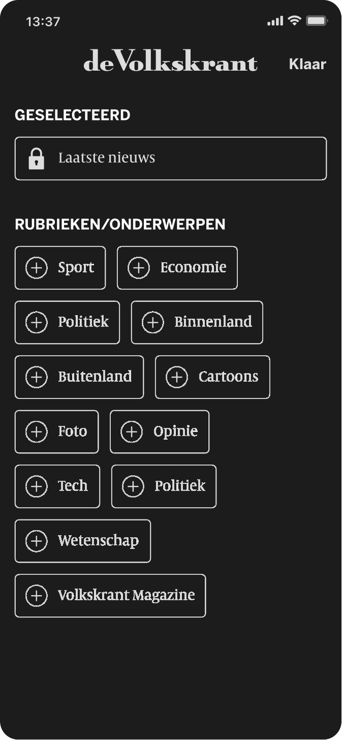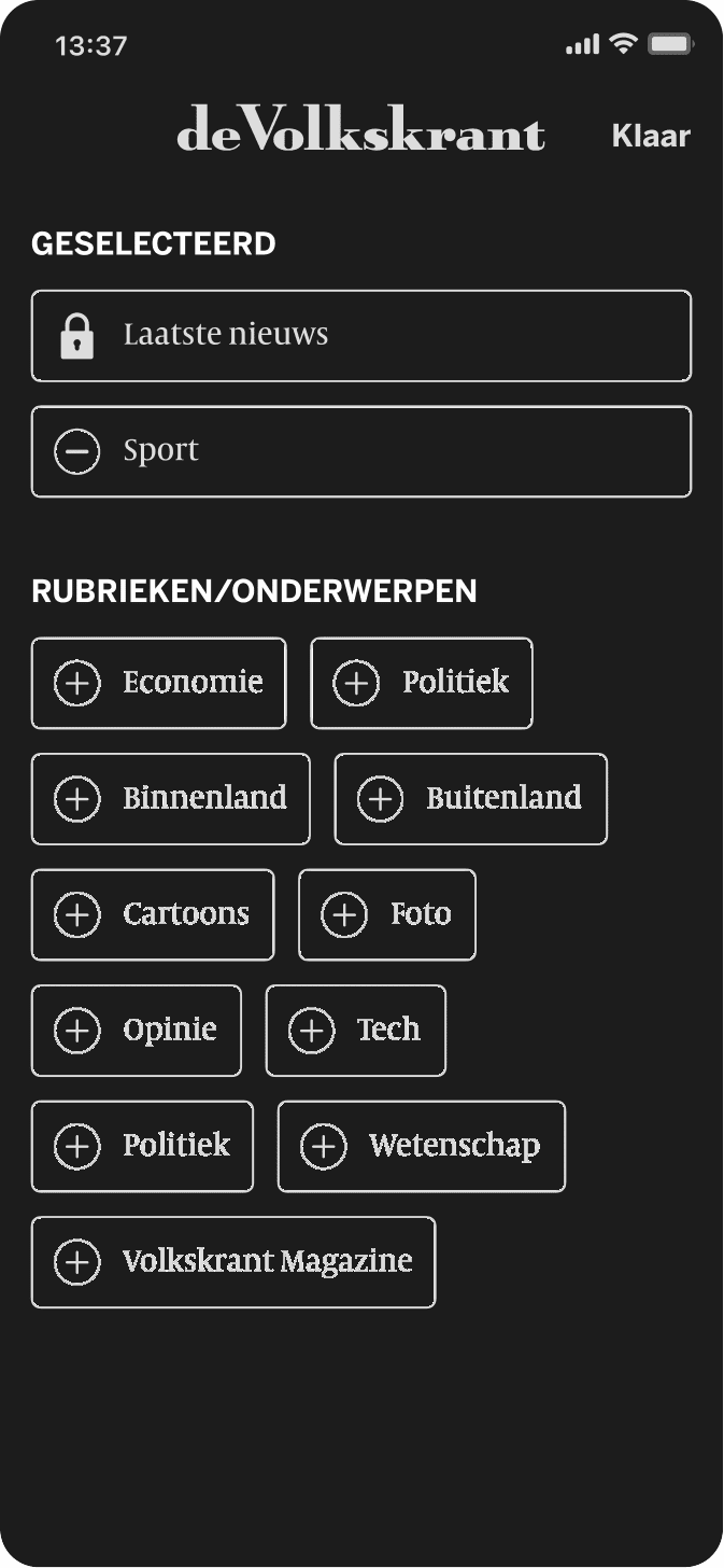 Gebruikers kunnen op het rondje met daarin het plus icoontje klikken om een story toe te voegen. Zodra ze daarop klikken zien ze welke rubriek/onderwerp al geselecteerd is en welke ze nog aan kunnen klikken. Het laatste nieuws blijft altijd op 1 staan en kan niet worden verwijderd of verplaatst, omdat je mensen niet helemaal in een eigen bubbel wilt plaatsen. Mochten er meerde rubrieken/onderwerpen aangeklikt zijn, dan kan de gebruiker deze rangschikken op persoonlijke voorkeur.