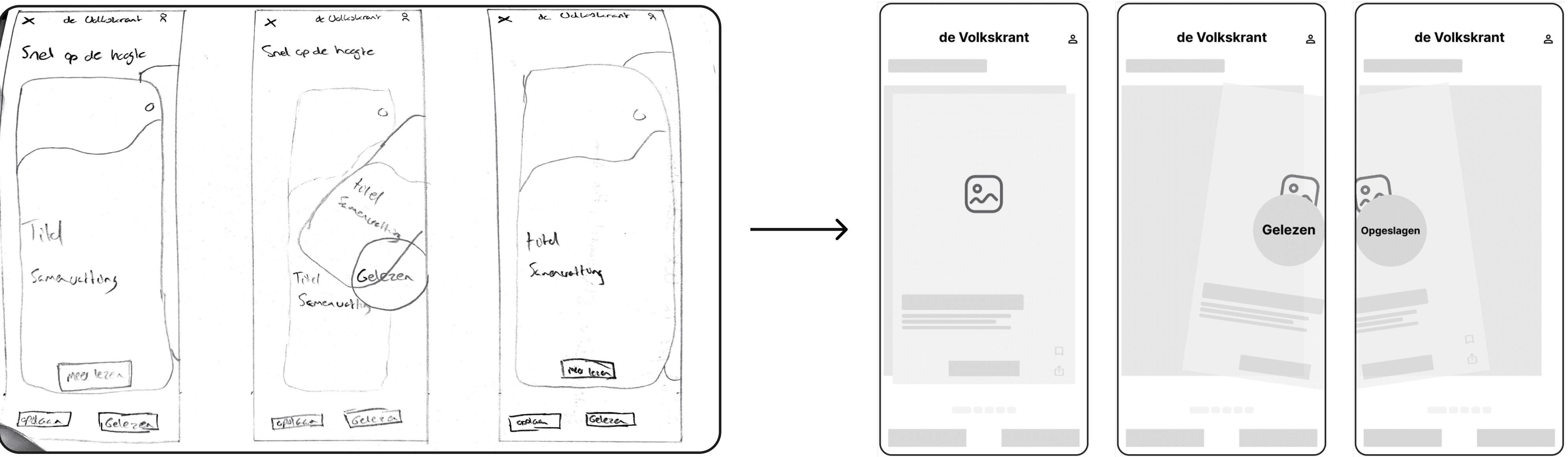 Om te achterhalen welk concept het beste aanslaat bij de gebruikers heb ik 6 interviews afgenomen. Ik heb twee mensen gesproken die de Volkskrant wel lezen en vier mensen die de Volkskrant niet lezen. Tijdens deze interviews ben ik samen met de participant door de concepten heengelopen en heb ik gevraagd: Wat vind je fijn? Wat vind je minder fijn? En wat zou je misschien anders doen?