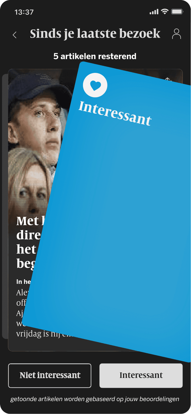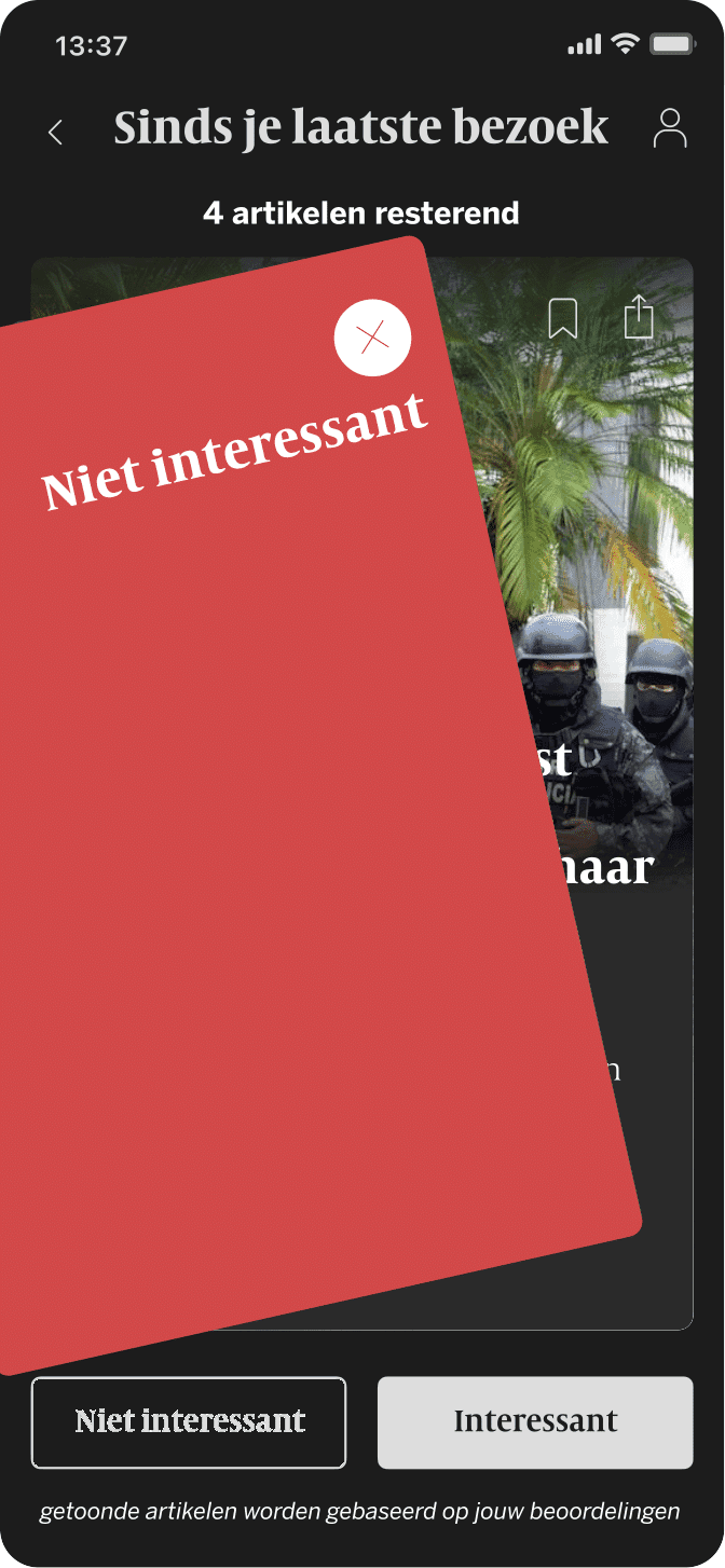 Als je de applicatie opent krijg je een aantal artikelen te zien die je op een Tinder-achtige manier kan swipen. Naar links swipen is niet interessant en naar rechts swipen betekent dat je het artikel interessant vindt. Ik heb daarnaast ook goed geluisterd naar een comment van waarin wordt aangegeven dat ik meer duidelijk moet maken dat het om een samenvatting gaat. Er staat nu boven de samenvatting de titel: “In het kort”. Hopelijk is het op deze manier duidelijker voor de gebruiker.