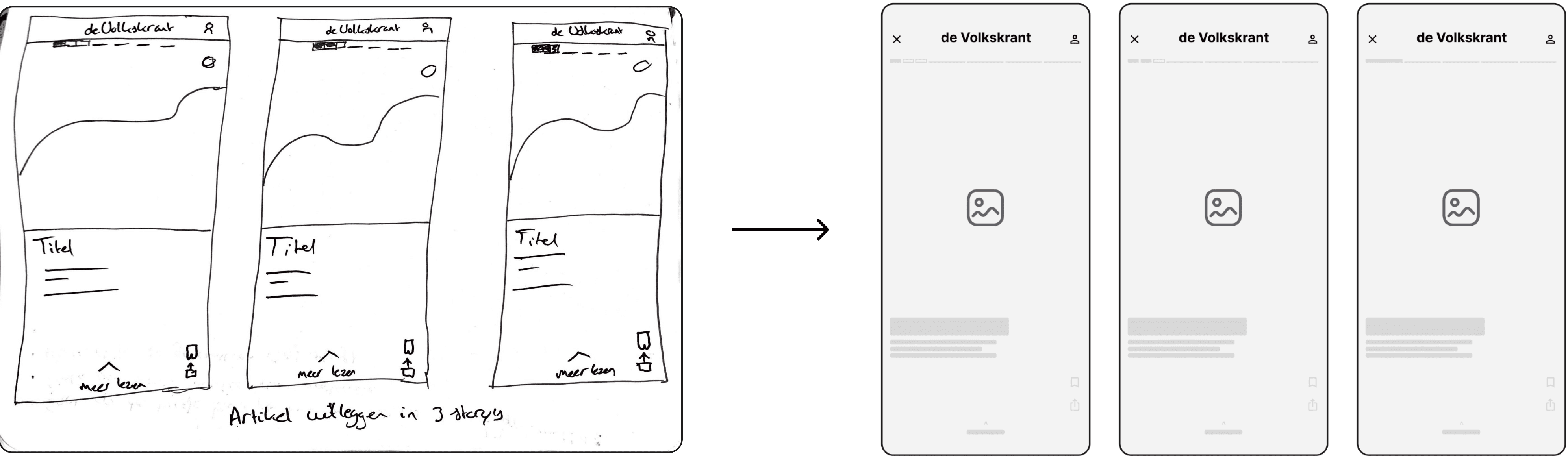 Dit concept kwam voort uit één van de wekelijkse meetings die wij hadden met ons afstudeergroepje. Tijdens de meeting liet ik mijn eerdere 3 concepten zien en toen kwam iemand met de suggestie hoe het eruit zou kunnen zien als je een artikel opdeelt in 3 story’s. Ik vond het een zeer goede suggestie en heb het meteen uitgewerkt.